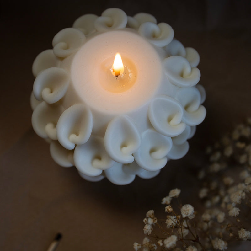 A hand-poured soy wax candle with an intricate flower shell design. Clean white finish and elegant sculptural shape make it ideal for decorative use or gifting. Burns evenly with a soft, steady flame. Made from vegan soy wax and free of synthetic dyes or additives.