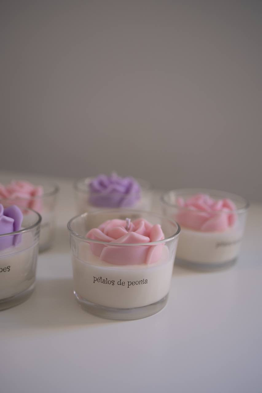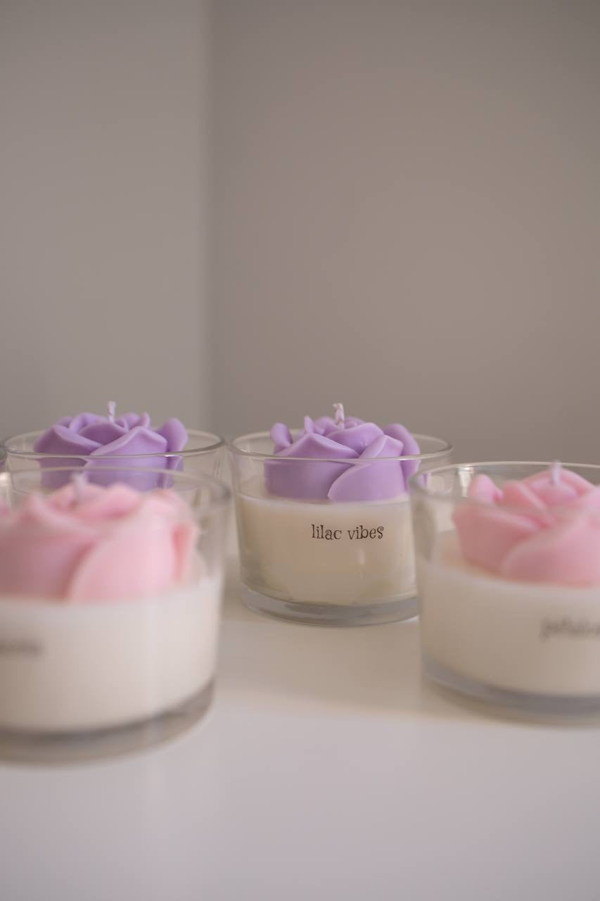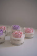 A hand-poured soy wax candle featuring a sculpted rose-shaped top in pink or purple. Made with vegan ingredients and designed for clean, even burning. Comes in a clear glass container for a modern, decorative touch. Ideal for gifts, self-care, or home accents.