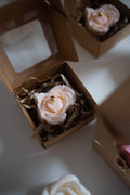 Hand-poured rose-shaped candle made from 100% vegan soy wax. Features detailed floral petals in soft pink and cream tones with a gold-painted wick base. Unscented. Ideal for gifts or decorative use. Burn time may vary depending on environment.