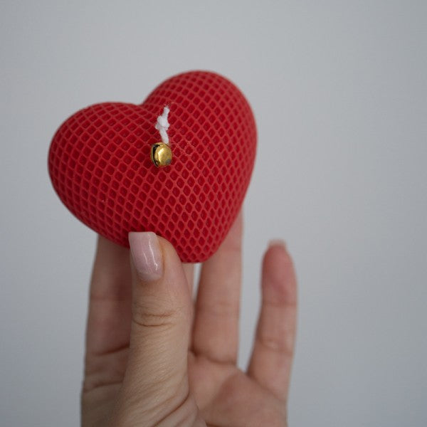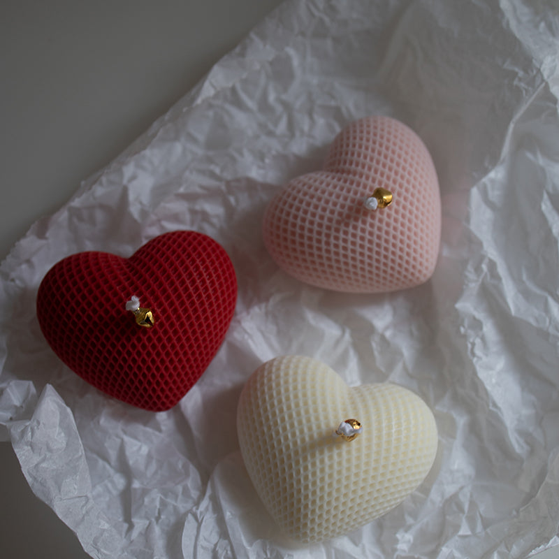 A hand-poured heart-shaped candle made from 100% vegan soy wax, featuring a raised textured surface and a small gold accent. This decorative candle adds a stylish touch to any room and is ideal for gifts, celebrations, or personal décor. Burns cleanly and evenly.